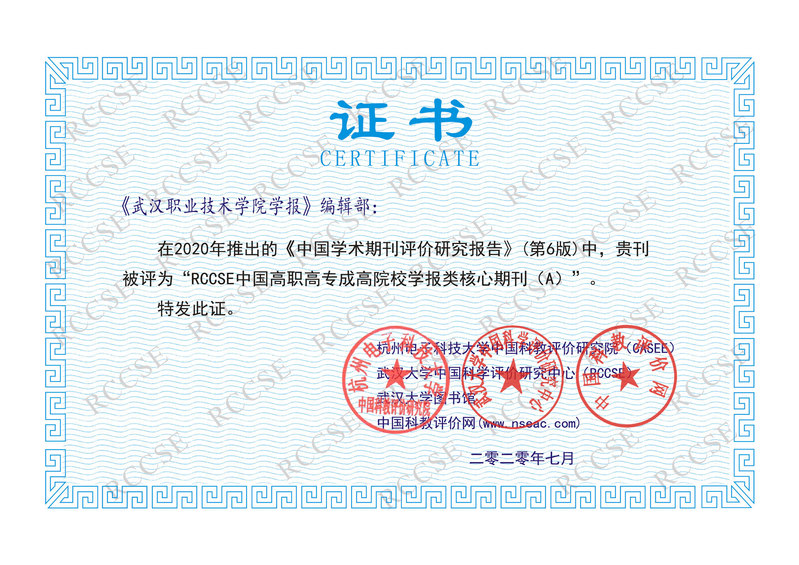 学报近几年加强创新力度,进行了一系列的改革,如取消分栏出版、定向专家约稿、开设热点专栏、编委会换届、加强制度建设、优化审稿流程等。在来源文献量、机构分布数、海外论文比、总被引频次数、他引率、他引刊数、学科扩散指标、学科影响指标、五年被引频次等综合期刊指标上均居于同类期刊前列。《武汉职业技术学院学报》自创办以来,办刊水平逐年稳步提升,学报自2009年进入RCCSE期刊评价来源行列,从当年评为B等到2020年被评定为“RCCSE中国核心学术期刊A等”,经过B、A-到A等的发展过程,标志着学报在创建品牌学术期刊进程中迈出了重要一步。